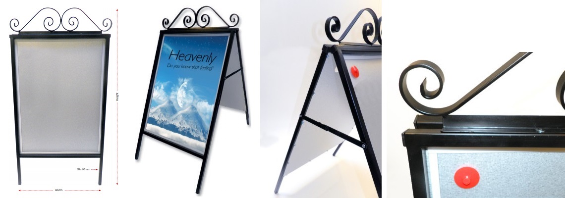 Klassiek A-bord met in de top sierelementen in smeedijzer look. De staanders zijn van 20x20 mm en zijn gelakt in zwart evenals de sierelementen. Beide zijden voorzien van ontspiegelend apet folie met magneetband. De postermaat is 50x70 cm. De afmetingen van het bord zijn 59 cm breed en 102 cm hoog. Gewicht 11 kg. Optie: brochurehouder. Wordt geleverd zonder poster. Indien gewenst kunnen wij deze tegen een bescheiden meerprijs meeleveren.Wilt u een prijs aanvragen?