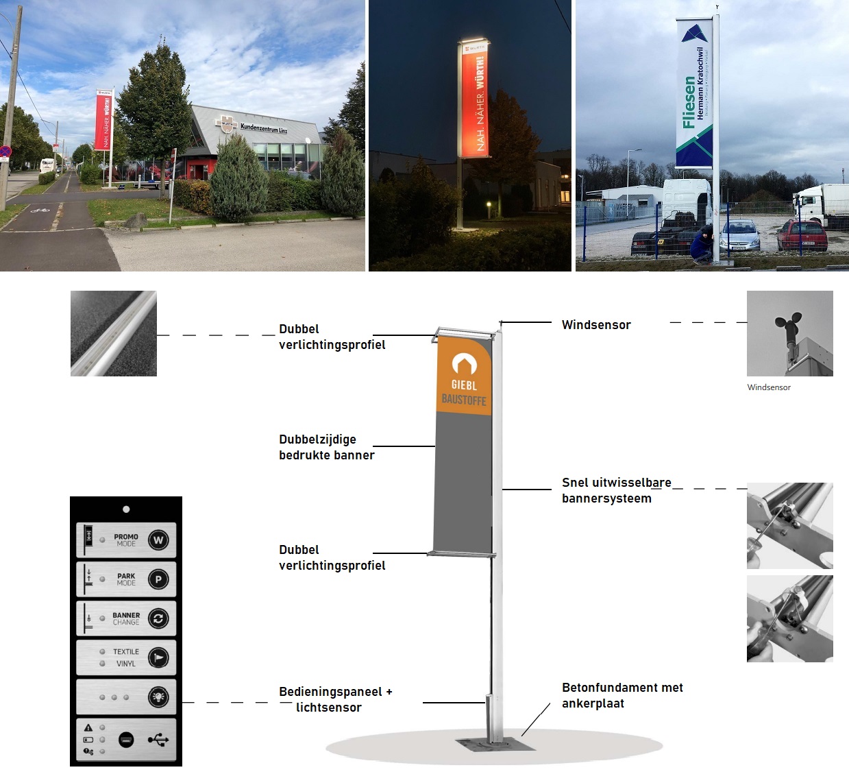 De eerste volautomatische stormbestendige baniermast met uw dubbelzijdige altijd zichtbare reclameboodschap of logopromotie. De eyepole® wordt bestuurd via een ingebouwde bedieningseenheid. Hier kunnen alle belangrijke functies met een druk op de knop worden geactiveerd en ingesteld. Geïntegreerde sturingselementen zorgen ervoor dat de banner altijd strak staat en beschermd wordt. Neemt de windsensor een windkracht 6 waar dan zal de banier zich automatisch oprollen en spant zich weer zodra de windkracht afneemt. De speciaal ontworpen, sensor gestuurde LED-verlichting zorgt ervoor dat uw boodschap ook wordt gezien bij schemer en nacht. Het exclusief ontwikkelde lenssysteem garandeert een krachtige en homogene belichting van uw banier. Door het uitgekiende spansysteem kan de banier gemakkelijk en snel worden gewisseld. De banier staat altijd in juiste richting om gezien te worden en door de dubbelzijdige bedrukking heeft u extra promotieoppervlak. De basisinstellingen van de eyepole kunnen via een USB-interface worden uitgevoerd en aangepast. De eyepole masten zijn verkrijgbaar vanaf 6 tot 10 m en met banners tot wel 500x150 cm. Door de elektriciteitsvoorziening heeft menig mast een dubbelfunctie bij gebruikers namelijk als hoogtedrager van beveiligingscamera s. Voor meer informatie zie bijgaande afbeeldingen en video.Wilt u een prijs aanvragen?
